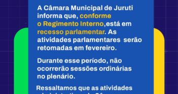 A Câmara Municipal de Juruti informa que, conforme o Regimento Interno, está em recesso parlamentar. As atividades parlamentares serão retomadas em fevereiro. Durante esse período, não ocorrerão sessões ordinárias no plenário. Ressaltamos que as atividades administrativas da Câmara seguem funcionando normalmente, de segunda a sexta, das 8h às 14h. Veja…